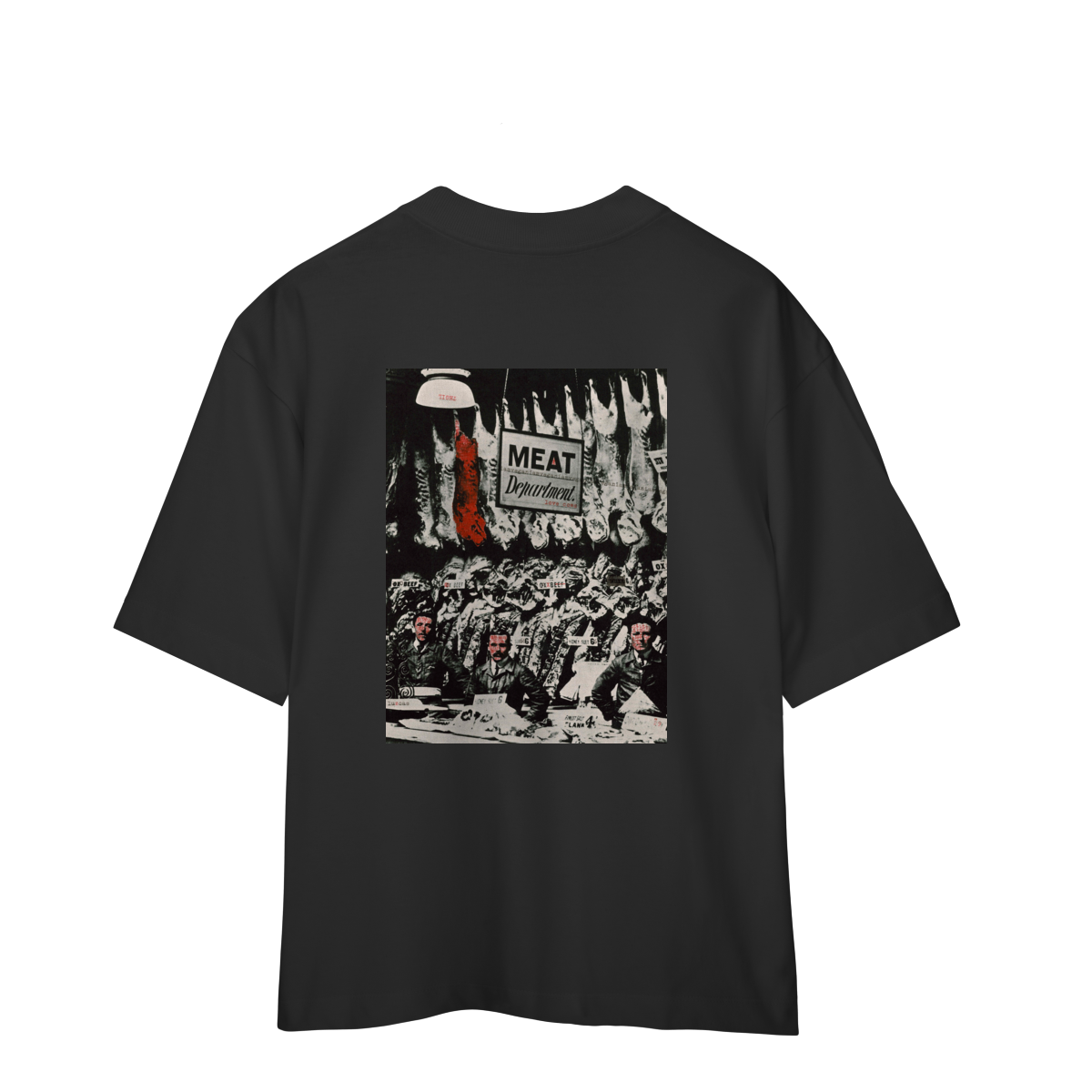 Estampa nas costas — frente lisa. “Meat” traz uma imagem direta, crítica e incômoda — os veganos não gostam dessa imagem. Arte em datilografia com impacto visual.